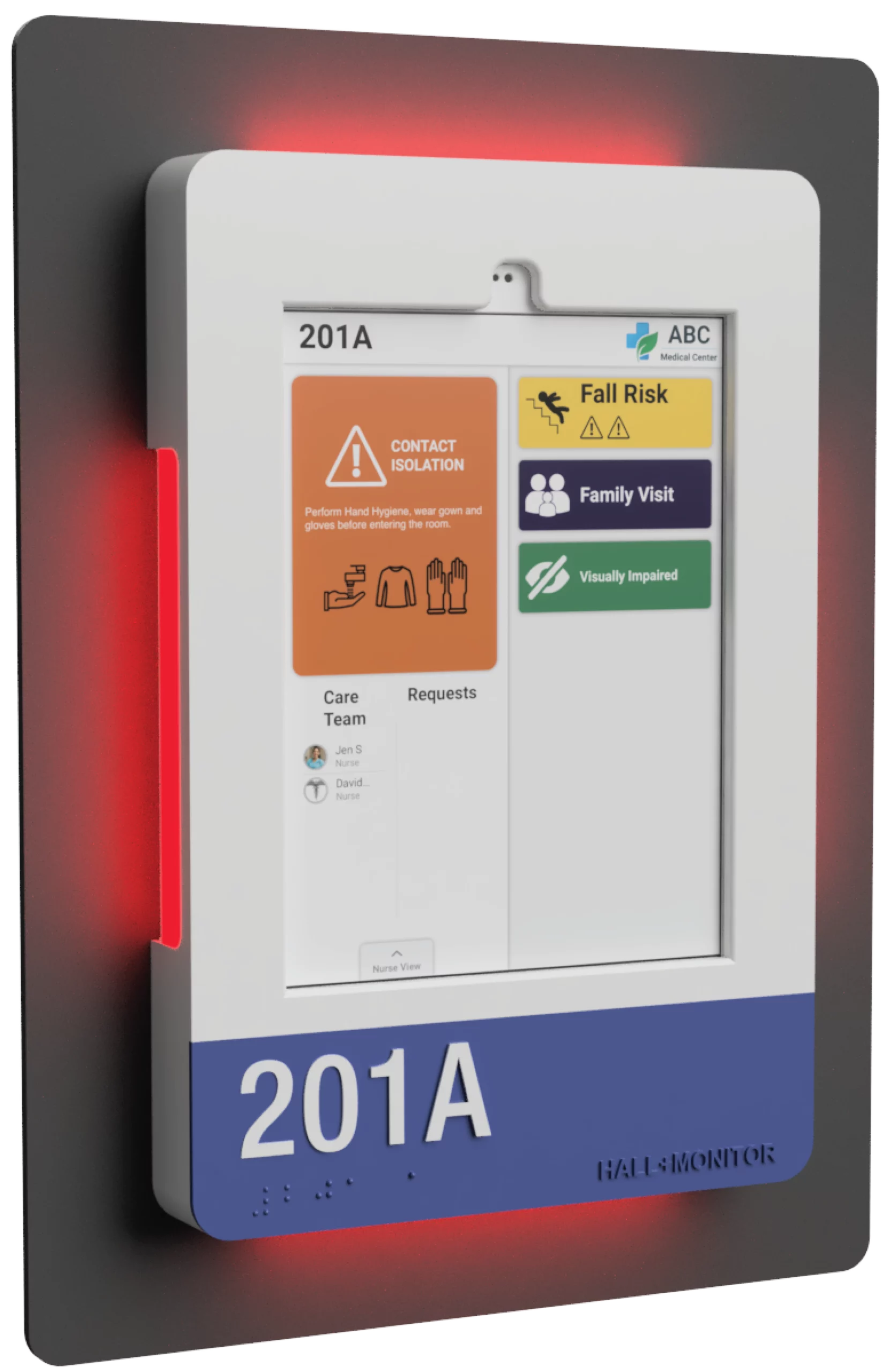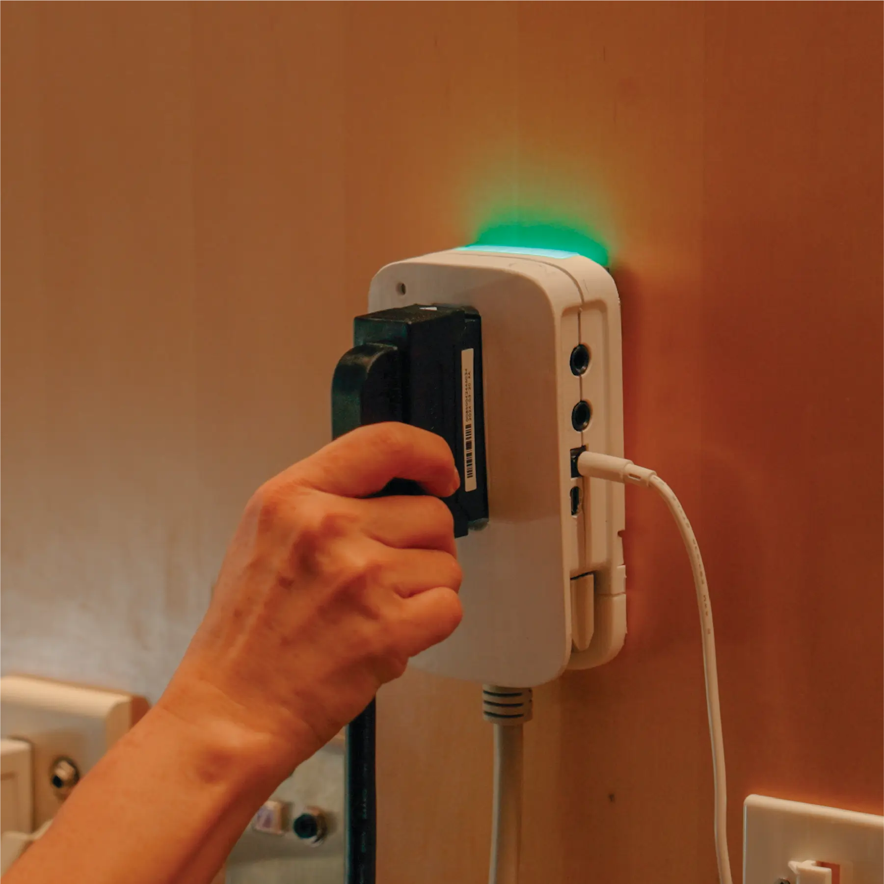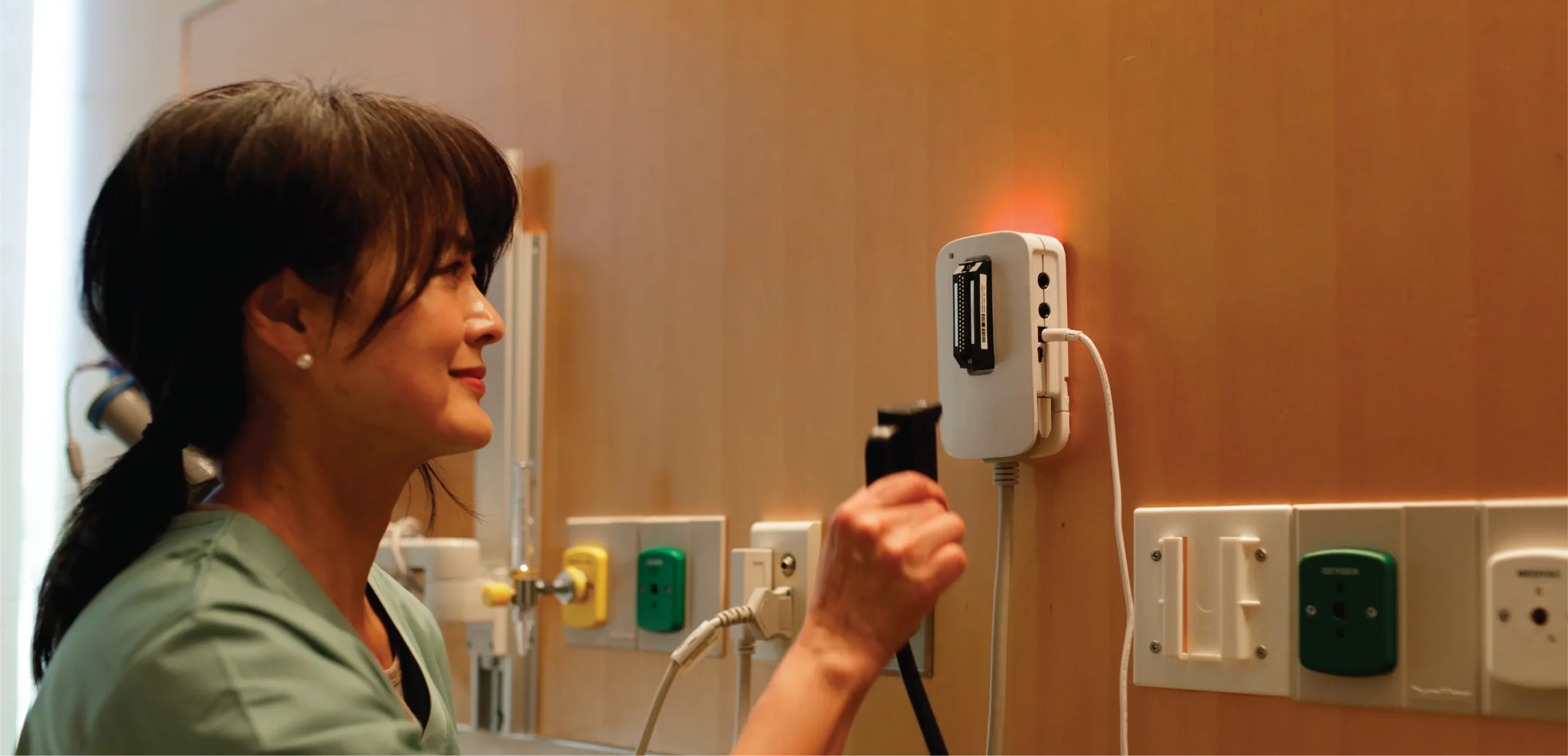The LED indicator will glow green when connected and red when disconnected — providing clear visibility to the care team at a glance.